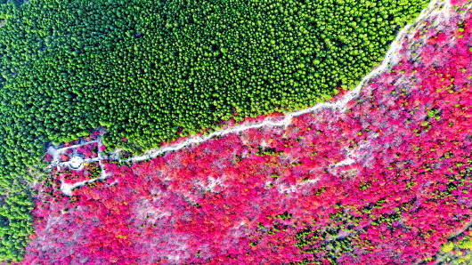 近日,济南天气晴好,蝎子山红叶进入最美时刻。蝎子山远望宛如一条翘尾巨蝎而得名,位置在市中区南高架桥北侧,以山脊为界,北山坡栽种松柏、南山坡种植黄栌,深秋时节黄栌由绿转红,空中俯瞰,半山青翠半山红,形成红与绿平分秋色的独特景观,犹如“鸳鸯火锅”,吸引大批市民前来欣赏秋色。今年,济南蝎子山与著名的香山、栖霞山、岳麓山等一起,被《中国国家地理》推荐为国内九大赏红叶胜地。图为11月3日拍摄的蝎子山“平分秋色”景观(无人机照片)。新华社发