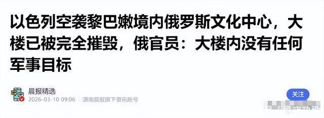 以色列军方突然对黎巴嫩境内的俄罗斯文化中心发动空袭,整栋大楼被彻底摧毁,此举瞬间引发国际社会广泛关注。 就在空袭发生前,美国总统特朗普刚释放出停火信号,暗示在伊朗的战事已基本结束。以色列的极端操作,被外界解读为对美国的强硬逼宫,甚至暗含“不下场,就一起完蛋”的强硬姿态。 3月9日,俄罗斯国际合作署署长普里马科夫正式确认,以色列军方对黎巴嫩南部纳巴蒂耶市内的俄罗斯文化中心“俄罗斯之家”实施了空袭。 据悉,这栋建筑并非军事设施,仅用于推广俄语、介绍俄罗斯文化和历史,是俄罗斯在当地开展文化交流的重要场所。 幸运的是,由于此前中东局势持续紧张,该文化中心已提前关闭,所有工作人员均已转移至安全区域,此次空袭未造成人员伤亡。 从现场曝光的画面来看,大楼在空袭后沦为一片废墟,墙体坍塌、残骸遍地,原本完好的建筑结构被彻底摧毁,破坏力可见一斑。 俄方明确表示,以军拥有全球顶尖的情报和精准打击能力,不可能误判民用设施与军事目标,此次轰炸显然是经过精心算计的行动。 以色列此次突袭俄罗斯文化中心,并非偶然,而是与其当前的战略焦虑密切相关。自2月28日美以联合对伊朗发动大规模军事打击以来,局势的发展并未如以色列预期。 以色列的核心诉求,是借美国之手彻底清除伊朗这个“生存威胁”,削弱伊朗的核能力和远程打击能力,巩固自身在中东地区的霸权地位。 但战事推进至今,美国设定的四大目标并未完全达成,尤其是让伊朗彻底屈服、签下严苛协议这一核心目标,始终毫无进展。 更让以色列焦虑的是,美国总统特朗普近期的表态,让其感受到了被“抛弃”的风险。特朗普在接受采访时,不仅暗示战事基本结束,还拒绝讨论“美国停火后以色列是否单独作战”的问题。 对以色列而言,失去美国的军事庇护和外交背书,自身在中东的处境将变得十分危险。伊朗的核研发能力虽被压制,但并未完全丧失,一旦美国抽身,伊朗很可能重新崛起。 此外,从国内政治来看,以色列现任政府依赖极右翼势力支持,唯有坚持强硬作战、标榜“彻底胜利”,才能稳住执政联盟,避免政府倒台。 此前加沙停火后,以色列政府曾险些分崩离析,此次伊朗战事成为其缓解内部矛盾的重要契机,自然不愿轻易放弃。 以色列轰炸俄罗斯文化中心,本质上是一场针对美国的“逼宫”行动。特朗普政府的停火倾向,让以色列彻底失去了耐心,只能通过极端手段逼迫美国继续留在中东战场。 以色列的意图十分明确:通过攻击俄罗斯的核心利益,挑衅俄罗斯介入冲突,让局势全面升级,从而彻底断绝美国抽身的可能。 一旦俄罗斯被卷入,中东冲突的规模将进一步扩大,美国即便想止损离场,也将被局势裹挟,不得不继续支持以色列。 有消息称,以色列已向美国放出狠话,若美国不愿继续下场强硬压制伊朗,以色列将单独行动,与伊朗死拼到底。 这种表态看似强硬,实则是以色列的无奈之举。其深知自身实力有限,若没有美国的支持,根本无法单独与伊朗抗衡,只能通过“逼宫”的方式,将美国牢牢捆绑在自己的战车上。 以色列媒体也曾爆出,耶路撒冷方面已向美国下达“最后通牒”,要求美国必须在谈判桌上对伊朗采取更强硬的态度,彻底解决伊朗的弹道导弹问题。 以色列的空袭行动发生后,俄罗斯方面迅速作出回应。俄方明确表示,“俄罗斯之家”内没有任何军事目标,此次空袭是公然的挑衅行为。 3月9日当天,俄罗斯与美国总统特朗普进行了长达一个多小时的通话,首次讨论伊朗局势,俄方强调这是一次“有益的沟通”,并呼吁各方通过政治外交途径结束战事。 从通话内容来看,俄罗斯并未打算被以色列拖入冲突,而是坚持外交解决的原则,相当于“无视”了以色列的挑衅,没有落入其圈套。 此前,俄罗斯驻伊朗总领馆曾在3月8日的袭击中受损,玻璃被震碎,数名工作人员被爆炸冲击波掀倒,俄方已要求各方切实保障外交人员安全。 伊朗方面则态度强硬,在特朗普释放谈判信号后,伊朗国安和外交委员会发言人明确表示,不会与美国进行任何谈判,将继续战斗直到特朗普宣布失败。 伊朗革命卫队更是放出狠话,若美以继续侵略伊朗,将禁止美国及其盟友从中东运出哪怕一升石油,掌握全球油价的主动权。 而美国方面的态度则显得十分微妙,特朗普嘴上表示将与以色列“共同决定”战事走向,但明眼人都能看出,最终决定权仍在美国手中。 美国防长曾明确表示,美军的目标是“把敌人打到屈服”,而非改造伊朗社会,这也暗示美国并不想陷入中东泥潭,只想达成核心目标后尽快抽身。 目前,中东局势已陷入多方拉扯的僵局:美国想尽快止损离场,保住国内选举大局;以色列急于逼美国继续下场,避免自身陷入孤立;伊朗则强硬到底,誓要与美以对抗到底。 以色列的极端逼宫行为,无疑加剧了局势的不确定性。若美国最终选择妥协,继续留在中东战场,冲突可能会进一步升级,波及更多国家。 若美国坚持抽身,以色列很可能会孤注一掷,单独对伊朗发动更大规模的打击,届时中东地区的动荡将进一步加剧,甚至可能引发更广泛的地区战争。 值得注意的是,俄罗斯虽然目前没有介入冲突的打算,但以色列多次挑衅其核心利益,也可能会改变俄方的立场,一旦俄罗斯介入,局势将彻底失控。 国际社会普遍呼吁,各方应保持克制,放弃军事对抗,重返谈判桌,通过政治外交手段化